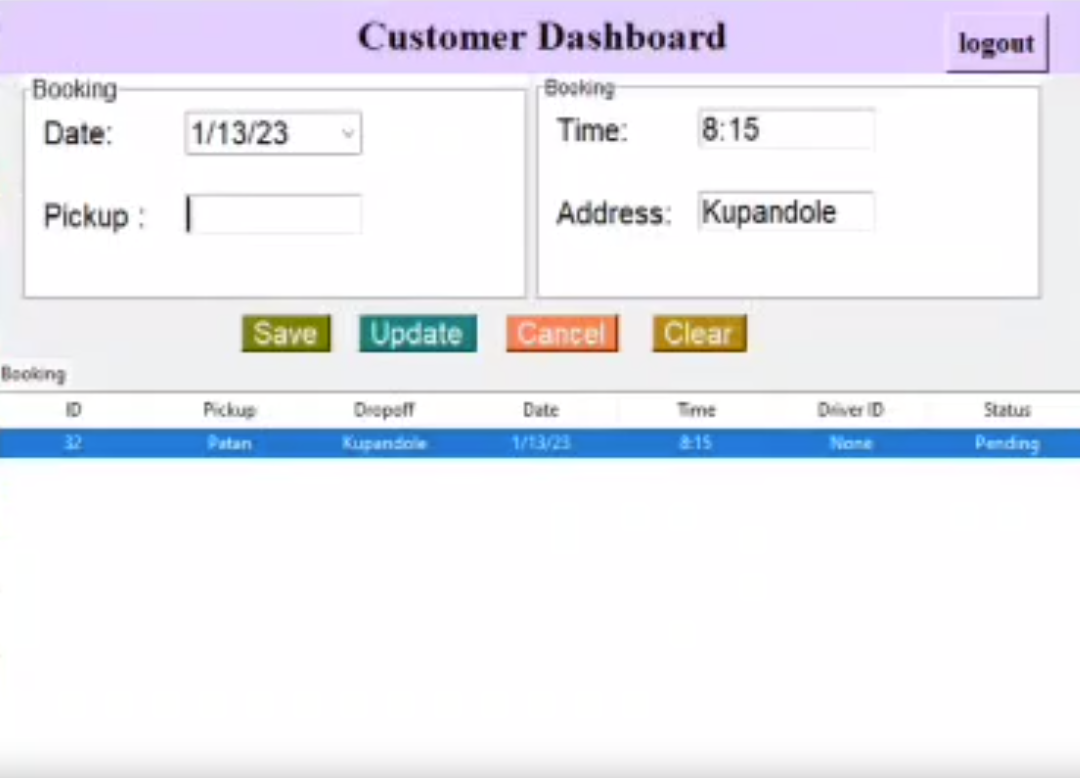 An intuitive desktop application for managing taxi bookings has been created, leveraging the Tkinter framework in conjunction with the Python programming language. This software system offers users a user-friendly interface through which they can efficiently make and manage taxi reservations.